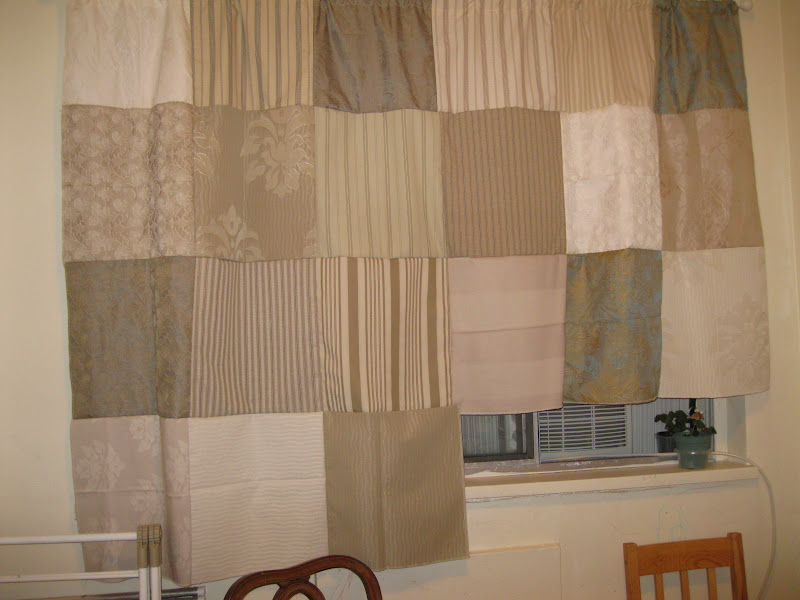 Here is an actual finished project. I had been given a huge stack of decorator fabric samples because I sew/quilt. But what to do with them? They're all different weights and fiber contents. I was about to donate them to Value Village in the hopes that someone would be able to do something with them when I had a brillient idea. A curtain for our kitchen! We usually just have a valance up there but in the summer is gets so hot in our west facing apartment with the sun beating in all evening. The bedsheet I had pinned up there last year is apparently gone. And something had to be done. This was perfect.